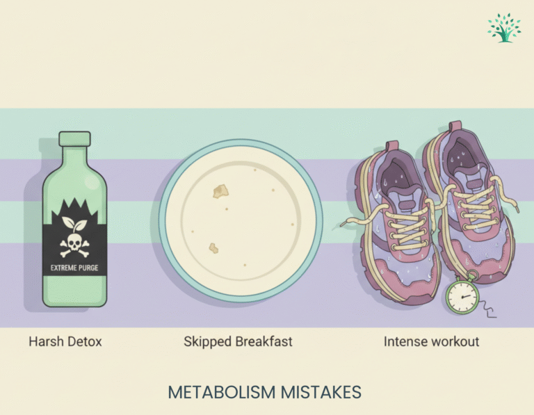 Another common mistake is jumping into extreme detoxes or cleanses. Liquid diets, juice-only days, or severe calorie cuts create a short-term drop on the scale, but they also slow your system. When your digestive rhythm shuts down, your body produces more stress hormones, which makes metabolism even less responsive. While the intention is good, these approaches work against your natural recovery process.