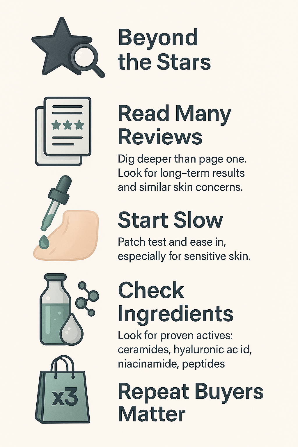 Look beyond the star rating. A product with thousands of reviews may still not be right for you. Instead of focusing only on the overall score, scroll through the detailed reviews. Check if people mention your specific skin concerns—like dryness, sensitivity, or breakouts.