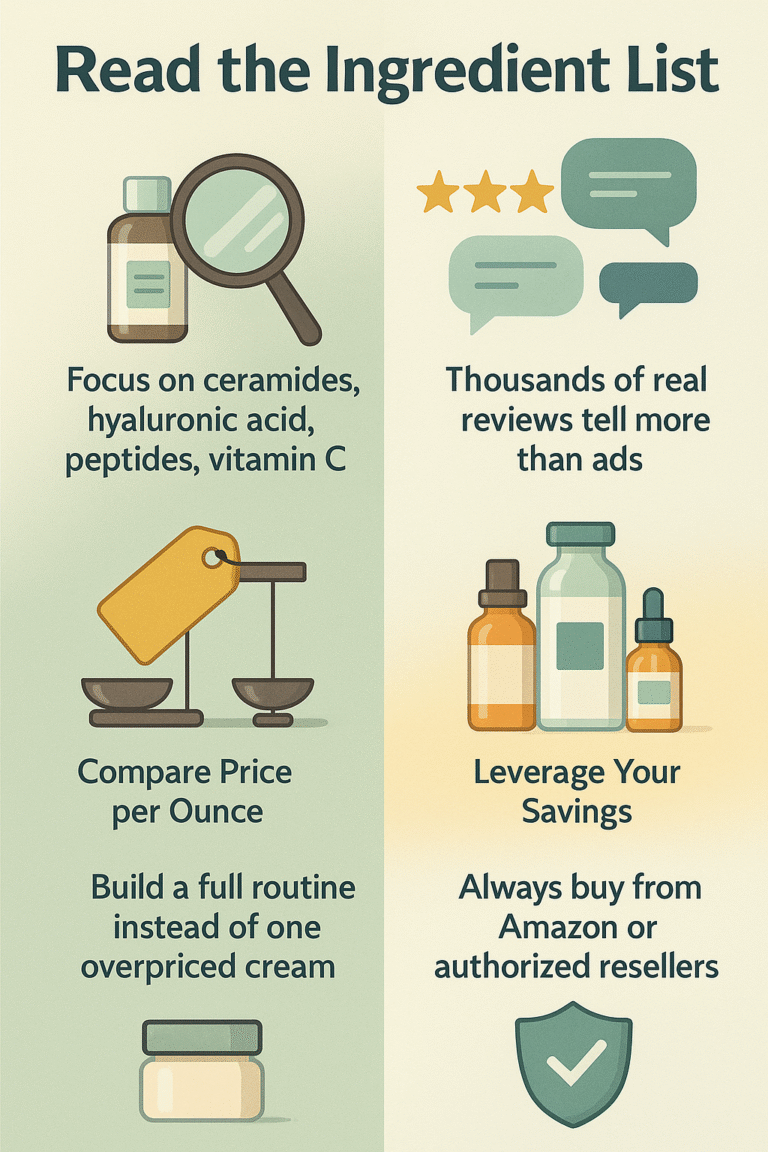 Another reason Amazon works so well for skincare dupes is price transparency. You can see side-by-side what luxury creams cost versus their affordable counterparts. When you realize the ingredient lists are nearly identical, it becomes obvious: you’re paying for marketing, not better science. Buying the dupe means keeping the hydration, peptides, and barrier repair your skin needs—without paying for the fancy jar.