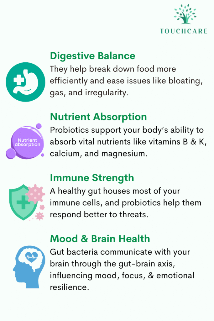 Probiotics are your internal support team for Digestive Balance, Nutrient Absorption, Immune Strength, and Mood & Brain Health.