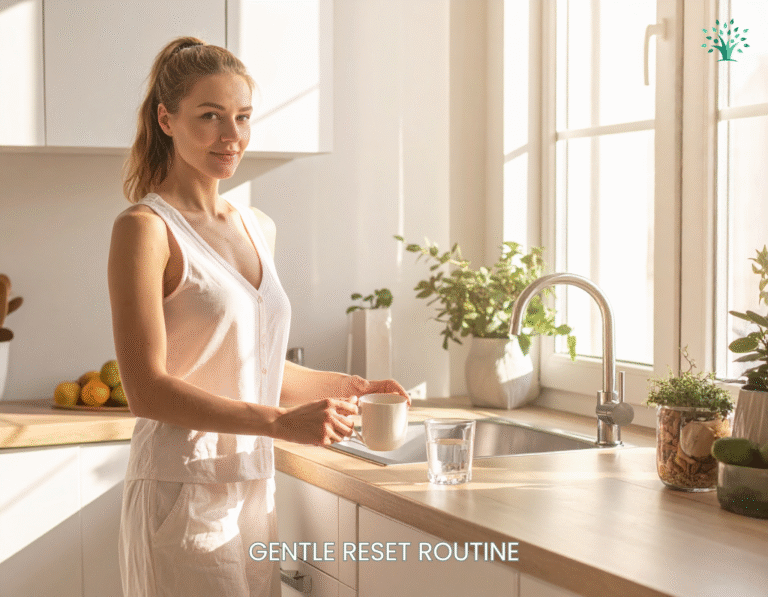Movement during this reset stays moderate. Walking outdoors in morning light helps recalibrate circadian rhythm. Gentle stretching or mobility work encourages circulation without spiking stress hormones.