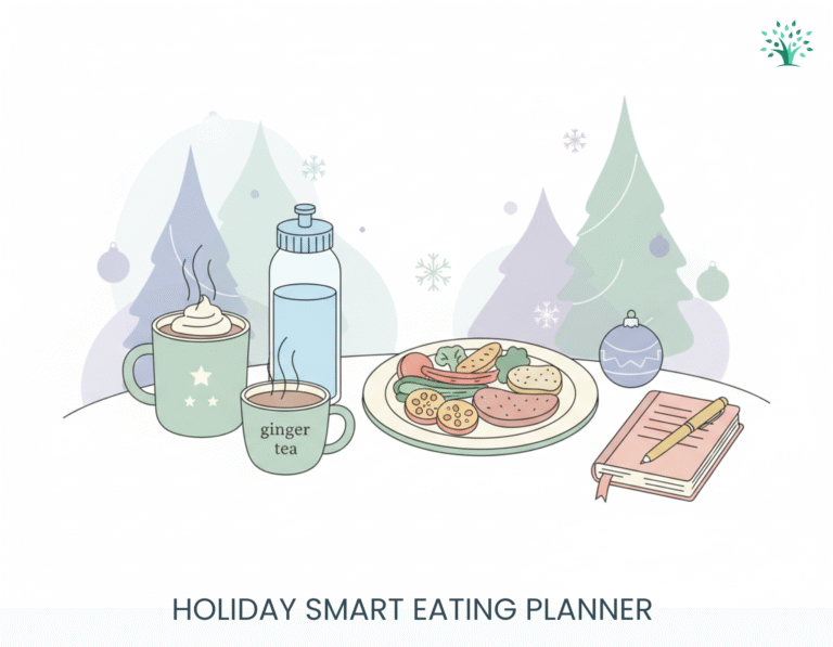 A gentle holiday smart eating guide for busy people. Learn how simple plate formulas, smart snacks, and hydration rhythms help you stay energized and avoid bloating.