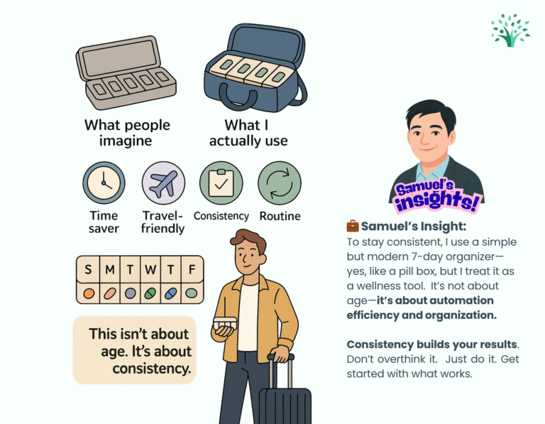 To stay consistent, I use a simple but modern 7-day Organizer—yes, like a pill box, but I treat it like a wellness system. One setup on Sunday, and I’m done thinking about it all week. It’s not about age—it’s about staying on track without the stress.