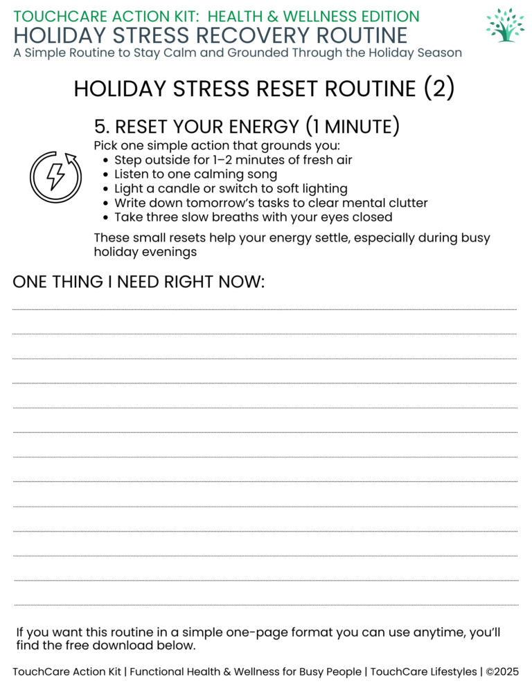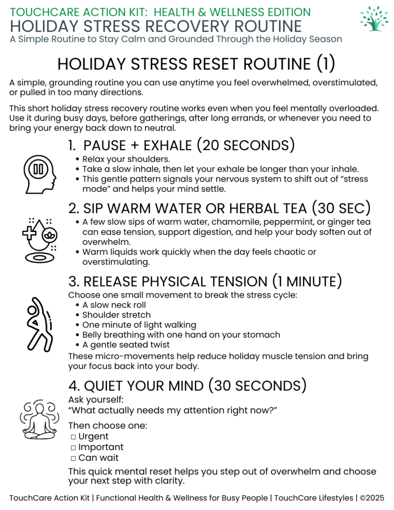 If you want a clear, calming structure to help you stay grounded through the holidays, you can download the Holiday Stress Recovery Routine — a TouchCare Action Kit with stress triggers, emotional check-ins, hydration support, a 3-minute calm reset, and a full weekly reflection system.