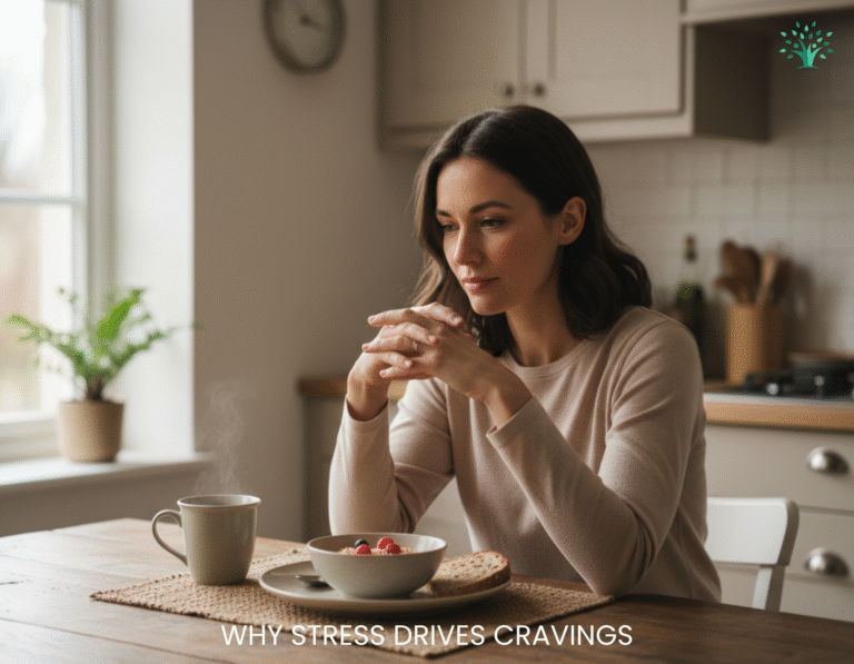 Stress doesn’t just slow digestion—it also changes what your body asks for. When stress hormones rise, the brain looks for fast energy and quick comfort, which is why cravings often show up alongside bloating.