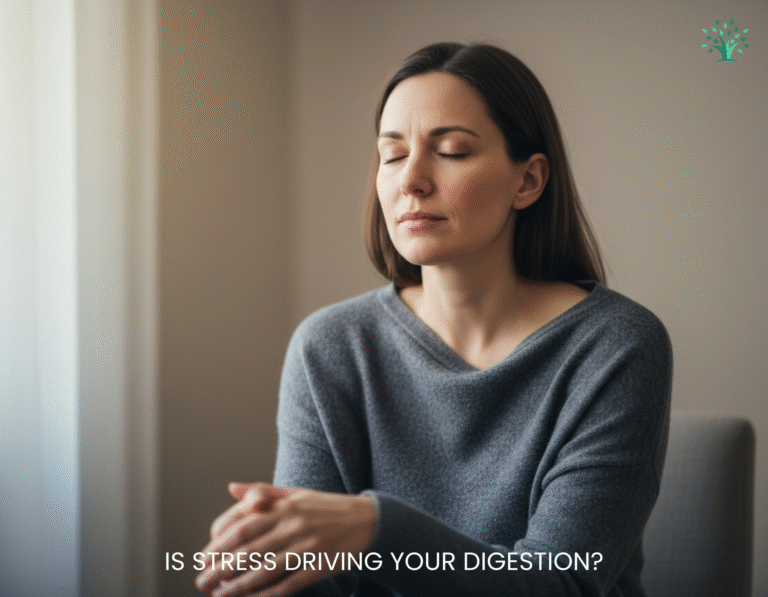 When stress is high, your nervous system shifts into survival mode. Blood flow is redirected away from digestion, gut movement slows, and cravings increase—especially for quick comfort foods. The result is bloating, irregular digestion, and that stuck, uncomfortable feeling that seems to come out of nowhere, even when your diet hasn’t changed.