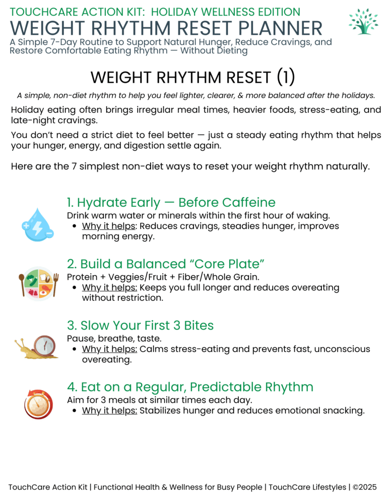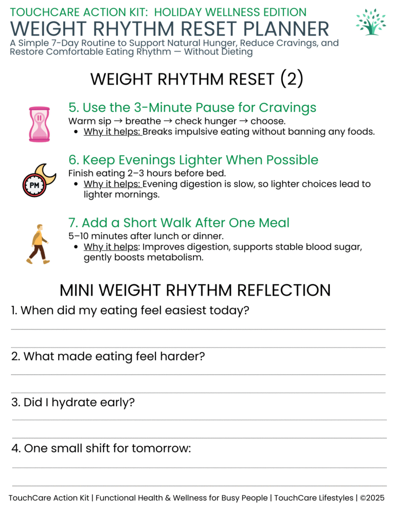 It’s a structured TouchCare Action Kit that builds on what you learned here, including daily rhythm anchors, hydration timing, meal rhythm guidance, digestion support prompts, appetite reflection pages, and simple check-ins to help your body settle back into a steady, predictable pattern without dieting or restriction.