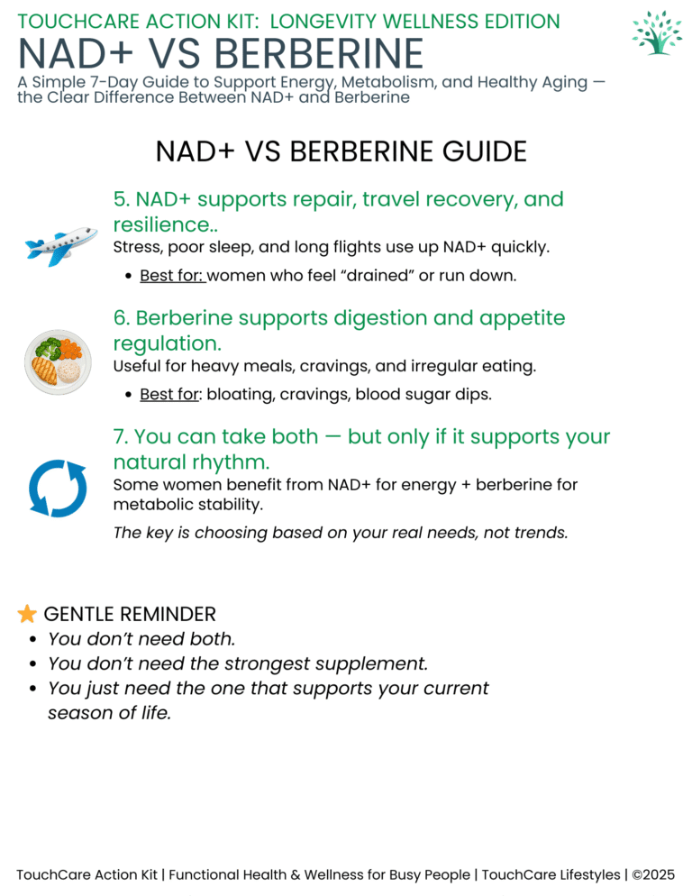 Some women use both — NAD+ for their cellular energy and berberine for their metabolic rhythm — but only during seasons when life feels demanding from every angle. For others, choosing one supplement creates more than enough stability. The beauty of this comparison is that it isn’t about choosing the “better” supplement. It’s about choosing the supplement that supports the rhythm your body is living in right now.