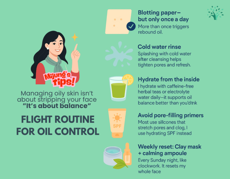 📥 BONUS: Download the 3-page printable infographic at the end of this post! Stick it to your mirror, skincare shelf, or journal—it covers Mijung’s real flight routine for oil control and the top skincare myths that are secretly making oily skin worse.