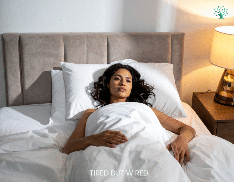 That pattern creates what many describe as “tired but wired.” Physically exhausted. Mentally active. Light sleep replaces deep recovery. Small noises cause micro-arousals. Heart rate remains slightly elevated.