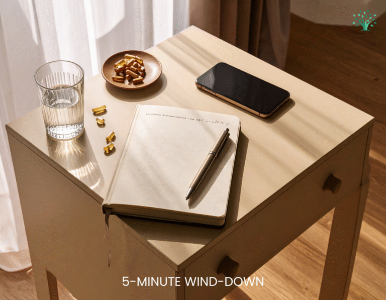 A structured five-minute sequence performed nightly trains the nervous system to shift gears. Light reduction signals melatonin production. Device cutoff lowers stimulation. Controlled breathing reduces sympathetic activation.