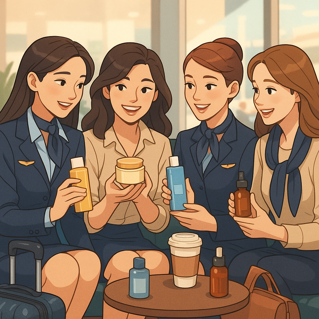 This mindset shaped my own approach. During my years as a Korean Air flight attendant, skincare wasn’t optional—it was part of the job. Long-haul flights, dry cabin air, and constant public attention meant we were looked upon as the standard of presentation in our age group. The focus was always on maintaining a strong skin barrier and deep hydration to keep skin luminous and healthy, no matter how little sleep we had.