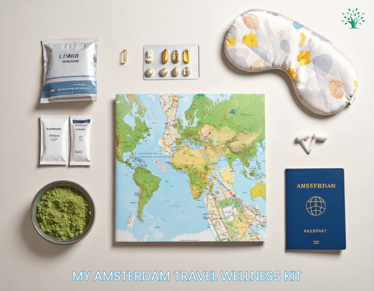 If you’ve ever wondered how I manage long days of walking, cycling, and flights in and out of Schiphol, here’s the travel-wellness kit that keeps me balanced and energized between hotels, airplanes, and city streets. These aren’t luxuries—they’re small tools that make Amsterdam travel wellness (and any trip) easier, calmer, and healthier.