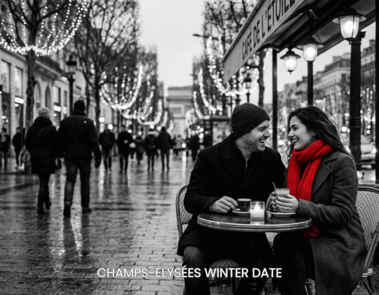 The lights were already on before the evening even began, stretching across the entire Champs-Élysées in a way that felt almost unreal. Rows of Christmas lights ran from one end of the avenue to the other, glowing softly above the street while storefronts below reflected every detail. The trees were wrapped in light, the displays were fully dressed, and the entire street carried a warm, golden tone against the cold air. People moved slower without realizing it, pausing, looking up, taking it in. There was no rush, no pressure—just that quiet Paris rhythm that makes you want to stay a little longer.
