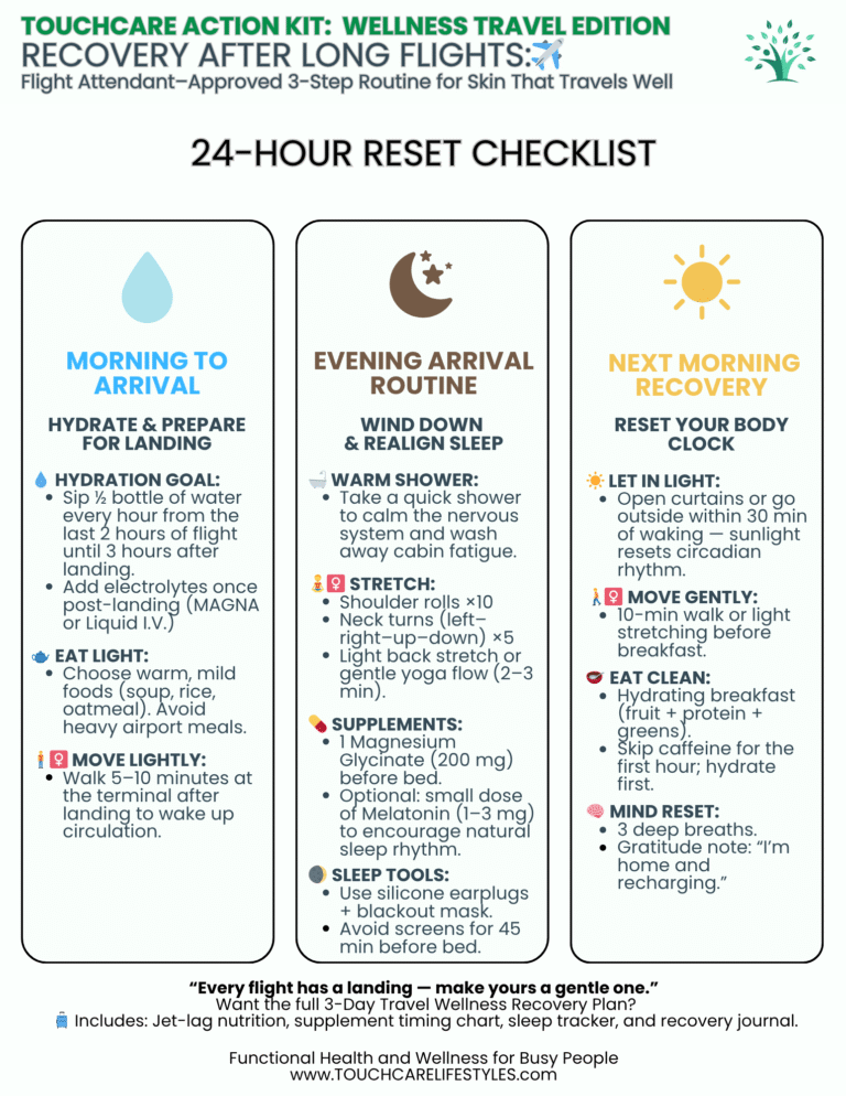 I’ve summarized this entire rhythm into a one-page 24-Hour Reset Checklist you can download or save below. It’s the same step-by-step system I follow after every long flight to rehydrate, realign sleep, and restore energy naturally.