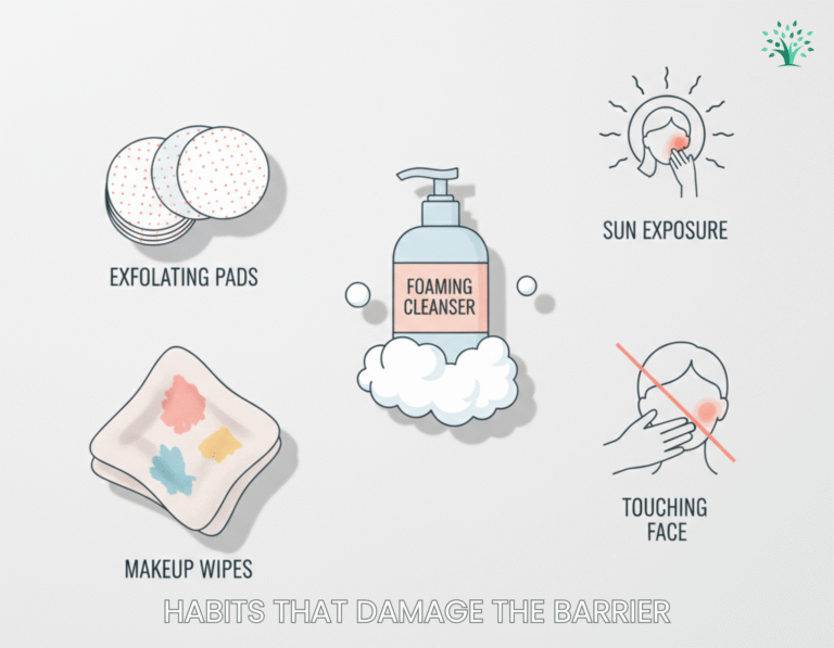 Over-cleansing is a major trigger. Washing too often or using strong foaming cleansers removes protective lipids your barrier needs. When those lipids disappear, the surface becomes fragile.